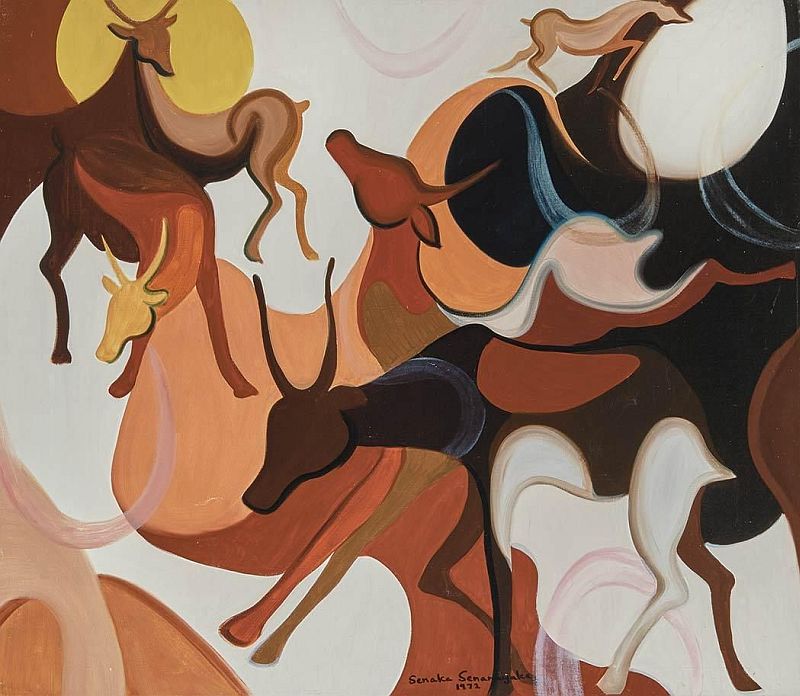 Los animales y plantas han sido un tema recurrente, así como el "círculo de la vida" que ahora se manifiesta como un globo de luz transparente en sus pinturas. Es un motivo budista esencial, que simboliza el eterno movimiento de la vida y la energía. Gran parte de su obra se basa en el círculo cósmico por su forma y fluidez, ya sea sus pinturas de un rebaño de ganado o lotos en flor. "He hecho algunas pinturas de bordes marcados, pero tiendo hacia el arte verdadero más que hacia las abstracciones", dice. Los colores de Senanayake son a menudo violentamente hermosos, una reacción a la belleza natural que se desvanece rápidamente alrededor de él. "Cuando era niño, a menudo buceaba en Sri Lanka y había bellos corales y muchos peces. Ahora, con el calentamiento oceánico y los cambios en los niveles de pH, el coral se está blanqueado y tendrás suerte si eres capaz de ver algún pez", dice.