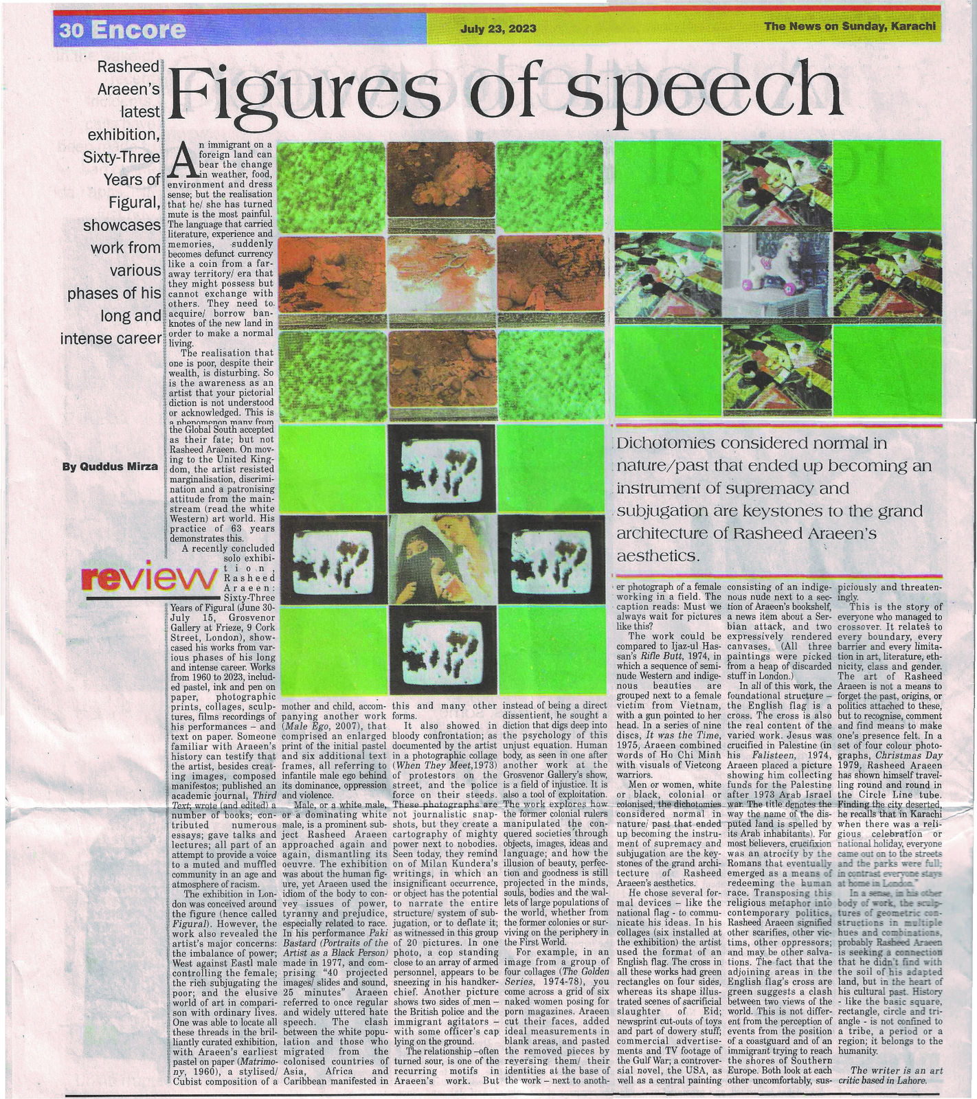 A recently concluded solo exhibition, Rasheed Araeen: Sixty-Three Years of Figural (June 30-July 15, Grosvenor Gallery at Frieze, 9 Cork Street, London), showcased his works from various phases of his long and intense career. Works from 1960 to 2023, included pastel, ink and pen on paper, photographic prints, collages, sculptures, films recordings of his performances - and text on paper. Someone familiar with Araeen's history can testify that the artist, besides creating images, composed manifestos; published an academic journal, Third Text; wrote (and edited) a number of books; contributed numerous essays; gave talks and lectures; all part of an attempt to provide a voice to a muted and muffled community in an age and atmosphere of racism.